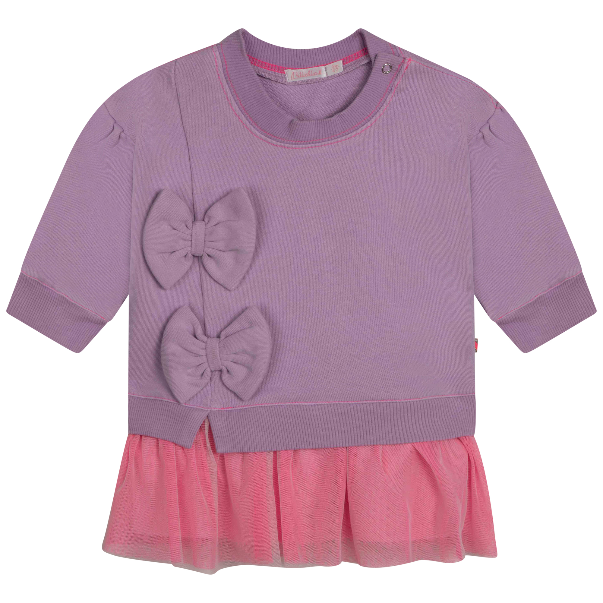 La jupe évasée de cette robe Billieblush est confectionnée en tulle doublé. Des noeuds devant apportent du volume sur le haut molletonné. Les boutons-pression sur l'épaule permettent de l'enfiler plus facilement. Un bord-côte finit le col rond, la taille basse fendue et les poignets.